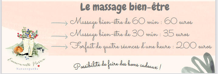 Rappel : la naturopathie est une approche complémentaire. Elle ne remplace en aucun cas votre suivi médical par votre médecin traitant ou un spécialiste Elle n’établit pas de diagnostic et ne prescrit pas de traitement. Elle ne vise pas l’arrêt ou le remplacement de vos traitements médicaux en cours. Le massage bien être n’est pas thérapeutique et n’a pas de caractère sexuel.